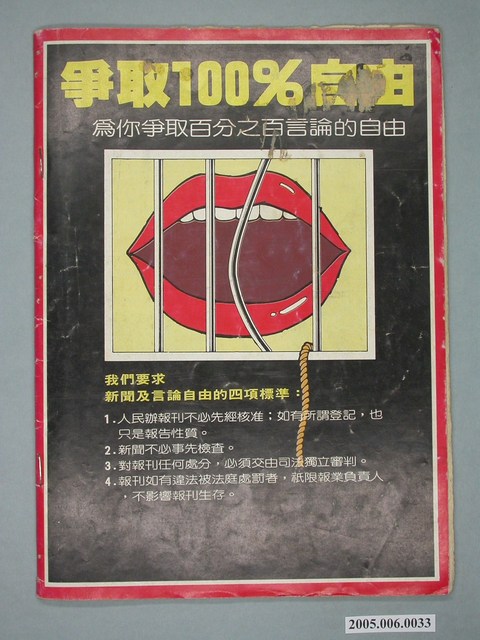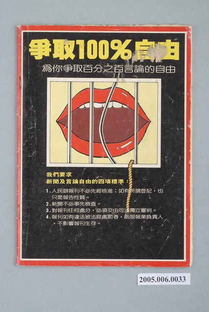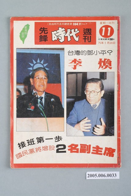 此為自由時代雜誌社1986年1月20日出版的《先鋒時代》週刊第11號總號第104號,內容計有〈台灣應該爭取獨立的政治地位〉(鄭南榕)、〈接班第一步──國民黨將增設2名副主席〉、〈台灣的鄧小平──李煥〉(李遠山)、〈一槍打出警察的原形──荒謬的「關廟分駐所槍擊案」〉(江惠森)、〈中台通商,不是「通敵」!〉(吳乃仁)、〈十二碗「高麗圓仔湯」的故事──全斗煥下計擺平反對黨〉、〈台灣黨外看韓國黨外〉(江蓋世)、〈新官場現形記──卸任縣市長爭出路〉(朱愛儂)、〈軍統衛生署──黑馬署長施純仁的故事〉(吳言)、〈白作工,也白罷工──和信興挾情治、黑道雙殺罷工〉(莊守義)、〈連長販賣軍火──林博文手榴彈之謎〉(杜雁紅)、〈賜予在黨,收回也在黨──中央日報解僱員工訴訟案〉(夏芝青)、〈留下一頁史篇──記「一九八四黨外文選」出版〉(賁馨儀)等。 此物件為鄭南榕所創辦的《自由時代》系列雜誌之一。由於意識到出版審查之嚴峻,鄭南榕在刊物創辦之初便註冊了為數眾多的「時代」系列標題,以免後續因遭查禁而無法準時出刊,另《自由時代》為保護相關供稿者,鄭南榕主動承擔《自由時代》一切文責,且不在雜誌目錄頁著錄個別作者姓名。《自由時代》標榜著「爭取百分之百的言論自由」,致力於追蹤黨國內幕、打破禁忌話題,也籌劃街頭社會運動――如「五一九綠色行動」。《自由時代》訴求黨外組黨,在民主進步黨成立後則主張群眾路線,對於較保守的公職路線則加以批判。 「黨外」一詞主要為非中國國民黨的臺灣政治勢力,而「黨外」政治勢力,主要的宣傳方式為「黨外雜誌」,「黨外雜誌」最早如1950年代的《自由中國》、1970年代的《大學》、《臺灣政論》,後在1980年代「黨外雜誌」發展蓬勃,代表刊物為《八十年代》與《美麗島》,最終,這股媒體趨勢在1986年民進黨成立、1987年解除戒嚴之後逐漸式微。「黨外雜誌」在當時激起了臺灣民眾的民主意識,也逐步促成了言論自由開放。(蕭淑玲,2006,153-155)。