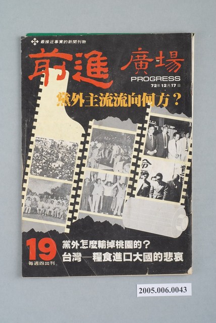 此物件為林正杰創辦的《前進》雜誌系列出版品之一。由於戒嚴期間的出版管制,《前進》面對警總的連番查禁,陸續更改刊名,計有《前進周刊》、《前進廣場》、《前進時代》、《前進世界》等。《前進》之創辦,以「在報禁下尋找更接近真實的客觀報導」為核心理念,其重要創辦人有林正杰、蔡式淵、蔡仁堅,三人皆為民進黨早期派系「前進系」成員。由於認同立場與民進黨在解嚴之後的路線相左,林正杰在1991年民進黨通過「臺獨黨綱」後宣布退黨,其所領導的「前進系」也隨之解散。 「黨外」一詞主要為非中國國民黨的臺灣政治勢力,而「黨外」政治勢力,主要的宣傳方式為「黨外雜誌」,「黨外雜誌」最早如1950年代的《自由中國》、1970年代的《大學》、《臺灣政論》,後在1980年代「黨外雜誌」發展蓬勃,代表刊物為《八十年代》與《美麗島》,最終,這股媒體趨勢在1986年民進黨成立、1987年解除戒嚴之後逐漸式微。「黨外雜誌」在當時激起了臺灣民眾的民主意識,也逐步促成了言論自由開放。(蕭淑玲,2006,153-155)。