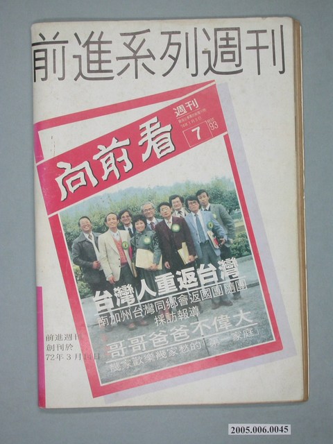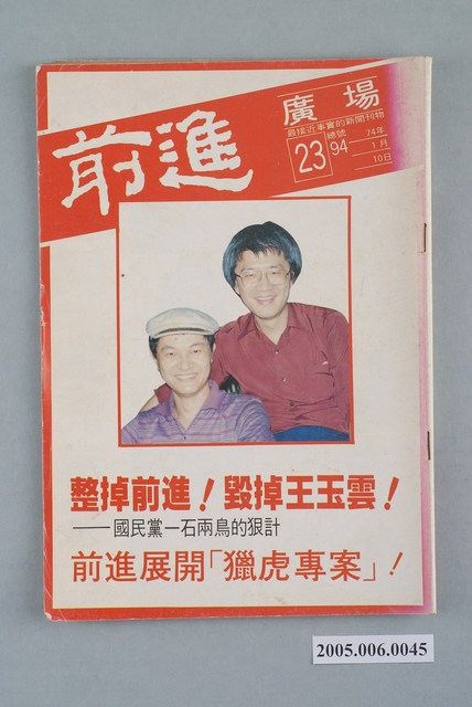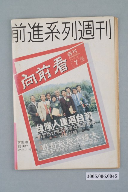 此物件為林正杰創辦的《前進》雜誌系列出版品之一。由於戒嚴期間的出版管制,《前進》面對警總的連番查禁,陸續更改刊名,計有《前進周刊》、《前進廣場》、《前進時代》、《前進世界》等。《前進》之創辦,以「在報禁下尋找更接近真實的客觀報導」為核心理念,其重要創辦人有林正杰、蔡式淵、蔡仁堅,三人皆為民進黨早期派系「前進系」成員。由於認同立場與民進黨在解嚴之後的路線相左,林正杰在1991年民進黨通過「臺獨黨綱」後宣布退黨,其所領導的「前進系」也隨之解散。 「黨外」一詞主要為非中國國民黨的臺灣政治勢力,而「黨外」政治勢力,主要的宣傳方式為「黨外雜誌」,「黨外雜誌」最早如1950年代的《自由中國》、1970年代的《大學》、《臺灣政論》,後在1980年代「黨外雜誌」發展蓬勃,代表刊物為《八十年代》與《美麗島》,最終,這股媒體趨勢在1986年民進黨成立、1987年解除戒嚴之後逐漸式微。「黨外雜誌」在當時激起了臺灣民眾的民主意識,也逐步促成了言論自由開放。(蕭淑玲,2006,153-155)。