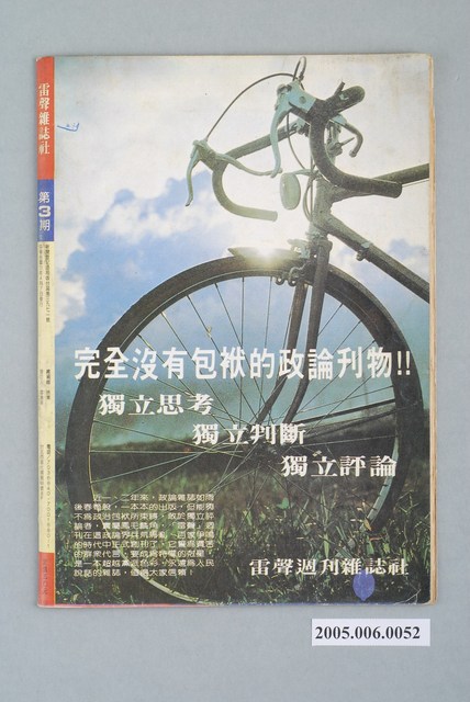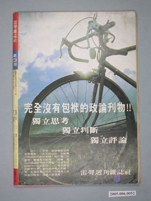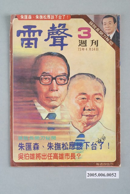 此為大學雜誌社於1984年出版的《雷聲》周刊第3號,內容計有〈這樣的教育部長還要戀棧嗎?-朱匯森應該鞠躬下台〉(黃雲)、〈朱撫松還能不下台嗎?-由亞青杯事件談起〉(王將)、〈不能再對韓國讓步了!-「亞青杯」是一個深刻的教訓〉(張光傑)、〈國民不願建立省主席任期制度-兩項臨時提案一波三折〉(司徒寤)、〈「陳鼓應事件」來龍去脈〉(黃宗華)、〈雖是同根生,相煎卻太急-評黨外的民主品格〉(王曉波)、〈「夏潮」對黨外的批判值得深思〉(韋名)、〈不要讓人權睡著了-論第三審訴訟與申請解釋憲法權〉(唐建國)、〈美國將售予中共何種飛彈?-台北的頭痛時間〉(子丹)、〈馬來西亞的反對勢力-執政黨「巫統」壓迫民主人士〉(陳漢華)、〈開大胸懷,用真人才,行康莊道!-為未來的新內閣和新政府獻言〉(金士)等。 此件為《雷聲》雜誌,主要創辦人為雷渝齊。《雷聲》創辦人雷渝齊為政治人物,出生於重慶,後加入國民黨。在1980年當選立法委員,但試圖在1983年再次參選時因未受國民黨提名而退黨參選,在1984年創辦《雷聲》雜誌並投身黨外運動,且以老兵權益為主題,後在1987年創辦「大公黨」,並自詡為「國民兩黨外的第三勢力」。 「黨外」一詞主要為非中國國民黨的臺灣政治勢力,而「黨外」政治勢力,主要的宣傳方式為「黨外雜誌」,「黨外雜誌」最早如1950年代的《自由中國》、1970年代的《大學》、《臺灣政論》,後在1980年代「黨外雜誌」發展蓬勃,代表刊物為《八十年代》與《美麗島》,最終,這股媒體趨勢在1986年民進黨成立、1987年解除戒嚴之後逐漸式微。「黨外雜誌」在當時激起了臺灣民眾的民主意識,也逐步促成了言論自由開放。(蕭淑玲,2006,153-155)。