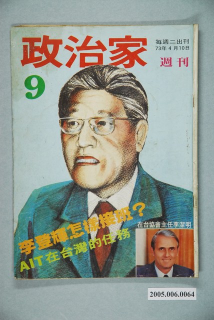 此物件為《政治家》雜誌,於1981年創辦,主要的創辦人為鄧維楨,相關系列刊物有《民主人》、《民主政治》、《民主叢書》、《觀察》等。鄧維楨為《大學雜誌》的創辦人,此雜誌於1960年代末期至1970年代初為臺灣社會帶來監督政府、社會改革的風氣,而到了美麗島事件後,造成民眾對政治議題的關心,鄧維楨也隨之創辦《政治家》雜誌,但因個人問題後改為弟弟鄧維賢負責,《政治家》主要介紹黨外人物,也加以介紹黨外的活動以及評論政治時局,有時也會述說黨外內部的爭議。 「黨外」一詞主要為非中國國民黨的臺灣政治勢力,而「黨外」政治勢力,主要的宣傳方式為「黨外雜誌」,「黨外雜誌」最早如1950年代的《自由中國》、1970年代的《大學》、《臺灣政論》,後在1980年代「黨外雜誌」發展蓬勃,代表刊物為《八十年代》與《美麗島》,最終,這股媒體趨勢在1986年民進黨成立、1987年解除戒嚴之後逐漸式微。「黨外雜誌」在當時激起了臺灣民眾的民主意識,也逐步促成了言論自由開放。(蕭淑玲,2006,153-155)。