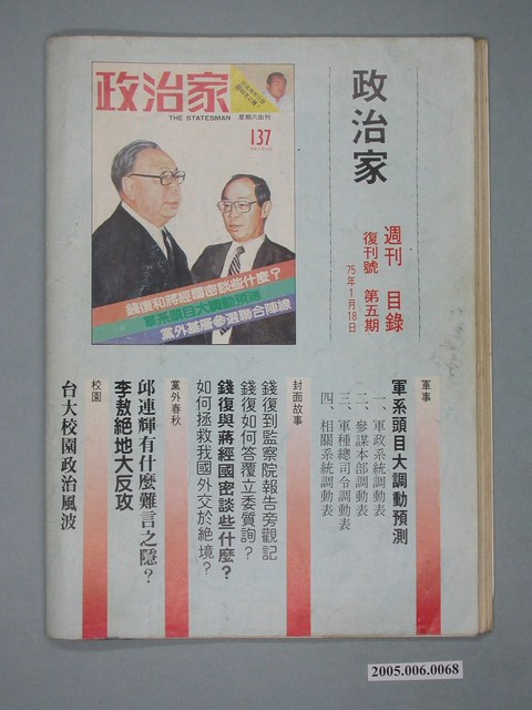 此物件為《政治家》雜誌,於1981年創辦,主要的創辦人為鄧維楨,相關系列刊物有《民主人》、《民主政治》、《民主叢書》、《觀察》等。鄧維楨為《大學雜誌》的創辦人,此雜誌於1960年代末期至1970年代初為臺灣社會帶來監督政府、社會改革的風氣,而到了美麗島事件後,造成民眾對政治議題的關心,鄧維楨也隨之創辦《政治家》雜誌,但因個人問題後改為弟弟鄧維賢負責,《政治家》主要介紹黨外人物,也加以介紹黨外的活動以及評論政治時局,有時也會述說黨外內部的爭議。 「黨外」一詞主要為非中國國民黨的臺灣政治勢力,而「黨外」政治勢力,主要的宣傳方式為「黨外雜誌」,「黨外雜誌」最早如1950年代的《自由中國》、1970年代的《大學》、《臺灣政論》,後在1980年代「黨外雜誌」發展蓬勃,代表刊物為《八十年代》與《美麗島》,最終,這股媒體趨勢在1986年民進黨成立、1987年解除戒嚴之後逐漸式微。「黨外雜誌」在當時激起了臺灣民眾的民主意識,也逐步促成了言論自由開放。(蕭淑玲,2006,153-155)。