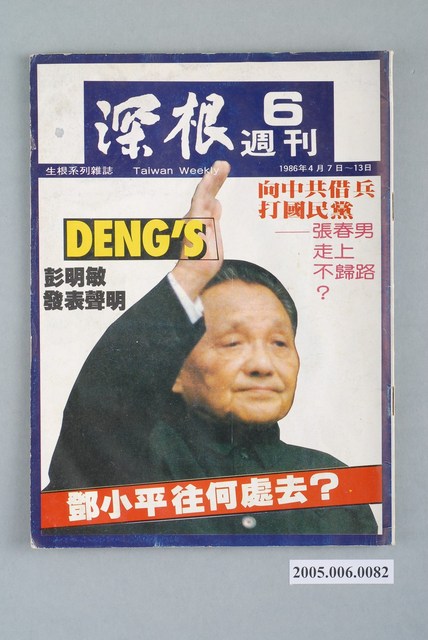 此件為《深耕》雜誌的系列刊物之一,《深耕》為1981年由黃石城創辦的黨外政論雜誌,後交由許榮淑經營,主要主筆人包含林正杰、林世煜、林濁水等,其中內容包括編輯手記、國會趨勢、選舉與黨外動向、生活與政治、鄉土人物、藝文、漫畫等等。《深耕》曾在1982年對於「杯葛事件」中的部分黨外立委進行批判,並引起當時黨外勢力的對立。 「黨外」一詞主要為非中國國民黨的臺灣政治勢力,而「黨外」政治勢力,主要的宣傳方式為「黨外雜誌」,「黨外雜誌」最早如1950年代的《自由中國》、1970年代的《大學》、《臺灣政論》,後在1980年代「黨外雜誌」發展蓬勃,代表刊物為《八十年代》與《美麗島》,最終,這股媒體趨勢在1986年民進黨成立、1987年解除戒嚴之後逐漸式微。「黨外雜誌」在當時激起了臺灣民眾的民主意識,也逐步促成了言論自由開放。(蕭淑玲,2006,153-155)。