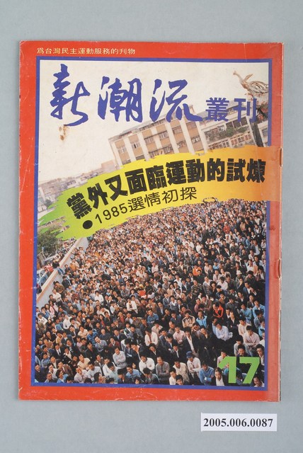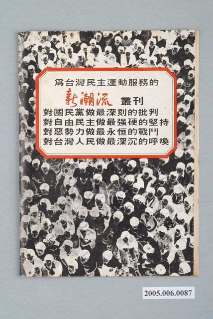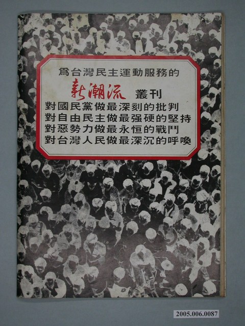 本物件為《新潮流》雜誌,此雜誌由吳乃仁、邱義仁等人於1984年創辦,此雜誌主要的十八位撰稿以及編輯人被稱為「十八飛鷹」,而這些人員後來加入民進黨後,成為其中的「新潮流」派系。新潮流以有著嚴格的紀律為名,並成為民進黨的一大派系之一。此派系中重要的人物有:吳乃仁、邱義仁、洪其昌、林濁水。 「黨外」一詞主要為非中國國民黨的臺灣政治勢力,而「黨外」政治勢力,主要的宣傳方式為「黨外雜誌」,「黨外雜誌」最早如1950年代的《自由中國》、1970年代的《大學》、《臺灣政論》,後在1980年代「黨外雜誌」發展蓬勃,代表刊物為《八十年代》與《美麗島》,最終,這股媒體趨勢在1986年民進黨成立、1987年解除戒嚴之後逐漸式微。「黨外雜誌」在當時激起了臺灣民眾的民主意識,也逐步促成了言論自由開放。(蕭淑玲,2006,153-155)。