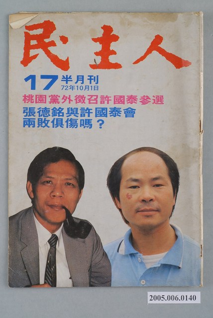 此物件為《民主人》雜誌,為《政治家》雜誌的系列刊物,主要的創辦人為鄧維楨,相關系列刊物有《民主政治》、《民主叢書》、《觀察》等。鄧維楨為《大學雜誌》的創辦人,此雜誌於1960年代末期至1970年代初為臺灣社會帶來監督政府、社會改革的風氣,而到了美麗島事件後,造成民眾對政治議題的關心,鄧維楨也隨之創辦《政治家》雜誌,但因個人問題後改為弟弟鄧維賢負責,《政治家》主要介紹黨外人物,也加以介紹黨外的活動以及評論政治時局,有時也會述說黨外內部的爭議。 「黨外」一詞主要為非中國國民黨的臺灣政治勢力,而「黨外」政治勢力,主要的宣傳方式為「黨外雜誌」,「黨外雜誌」最早如1950年代的《自由中國》、1970年代的《大學》、《臺灣政論》,後在1980年代「黨外雜誌」發展蓬勃,代表刊物為《八十年代》與《美麗島》,最終,這股媒體趨勢在1986年民進黨成立、1987年解除戒嚴之後逐漸式微。「黨外雜誌」在當時激起了臺灣民眾的民主意識,也逐步促成了言論自由開放。(蕭淑玲,2006,153-155)。