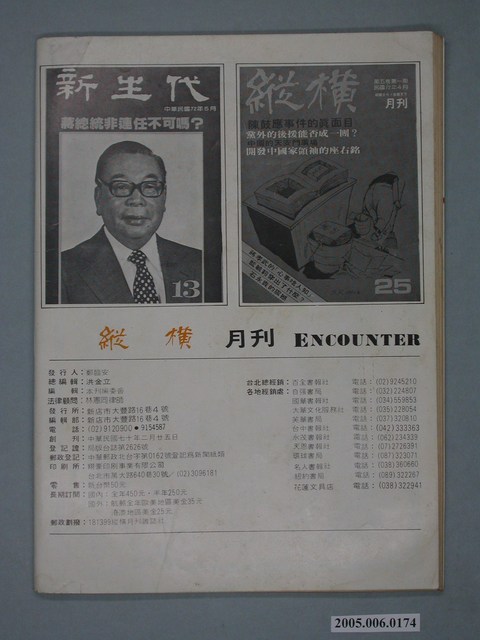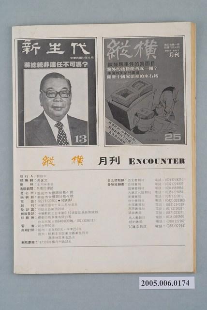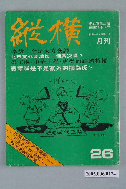 此為縱橫雜誌社1983年5月出版的《縱橫》月刊第5卷第2期總號26號,內容計有〈女安則為之-給李敖的諍言〉(王曉波)、〈做光明磊落的朋友,做光明磊落的敵人〉(李敖)、〈將軍猶當令中?-王昇的調職與動向〉(王不落)、〈吳豐山與謝東閔副總統〉(洪金立)、〈是「擔架」,還是「十字架」?-評時報雜誌理論家對「批康」的理解〉( 蘇多)、〈黨外的「荒原」是怎麼失落的?-給台北縣黨外的諍言〉(廖志倫)、〈最是蒼白風塵路-設立「色情特區」的必要性和迫切性〉(林清松)、〈不要為「綠卡」粉壁塗牆!〉(張德銘)、〈只許州官放火,不准百姓點燈-票據法的公平性在那裏?〉( 張德銘)、〈路是人走出來的-為什麼有人反對黨外「後援團」?〉( 劉慶生)、〈「劫機」帶來的大陸訊息〉(江水蓮)、〈中國時報「猴急」些什麼?〉(曾儍)、〈黃天中要上大陸教書?〉等。 此件為縱橫雜誌社出版的《縱橫》雜誌,最早於1981年由鄭臨安創刊,由宋文誠主編,為1980年代的黨外雜誌之一。《縱橫》試圖連接黨內與黨外勢力,讓國民黨能正視黨外勢力,產生兩黨競爭的利民主改革。另外在統獨立場上,《縱橫》雜誌則反對臺灣獨立,偏向統一立場。 「黨外」一詞主要為非中國國民黨的臺灣政治勢力,而「黨外」政治勢力,主要的宣傳方式為「黨外雜誌」,「黨外雜誌」最早如1950年代的《自由中國》、1970年代的《大學》、《臺灣政論》,後在1980年代「黨外雜誌」發展蓬勃,代表刊物為《八十年代》與《美麗島》,最終,這股媒體趨勢在1986年民進黨成立、1987年解除戒嚴之後逐漸式微。「黨外雜誌」在當時激起了臺灣民眾的民主意識,也逐步促成了言論自由開放。(蕭淑玲,2006,153-155)。