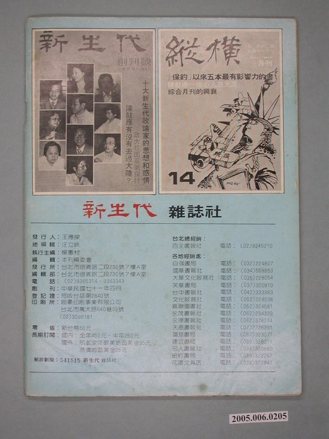 此為新生代雜誌社1982年6月出版的《新生代》雜誌第2號,內容計有〈評五本最差勁的政論雜誌:中國報導-弄臣.走狗.淚、.掃蕩-橫衝.亂砍.鬥、.代議士-山頭.綠林.砲、龍旗-愛國.發燒.罪、顯微鏡-近視.羅織.詭〉、〈陶先生,新生代支持你!〉(李凡)、〈食之無味,棄之不可惜!-評「劉福增專欄」〉(殷海洋)、〈對「致最高敬意」的歷史探討--兼評康寧祥〉(汪恒祥)、〈驕傲的台大?虛榮的台大〉(張晉城)、〈學生主權意識的沒落與重建〉(陸以得)、〈應該讓國代通通出國去!〉(潘榮禮)、〈經濟,經濟,多少罪惡假汝之名以行!〉(林凌)、〈一個新聞從業員的道德守則-談談「亞洲商報」對陳鼓應教授的政治誣陷〉(楊升橋)等。 《新生代》月刊創刊於1982年4月,總編輯為汪立峽。在當時黨外雜誌的光譜中,《新生代》屬於較為保守穩健的一端,其政論立場傾向於體制內改革,提倡不分黨內外的民主運動。 「黨外」一詞主要為非中國國民黨的臺灣政治勢力,而「黨外」政治勢力,主要的宣傳方式為「黨外雜誌」,「黨外雜誌」最早如1950年代的《自由中國》、1970年代的《大學》、《臺灣政論》,後在1980年代「黨外雜誌」發展蓬勃,代表刊物為《八十年代》與《美麗島》,最終,這股媒體趨勢在1986年民進黨成立、1987年解除戒嚴之後逐漸式微。「黨外雜誌」在當時激起了臺灣民眾的民主意識,也逐步促成了言論自由開放。(蕭淑玲,2006,153-155)。