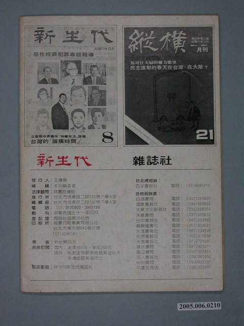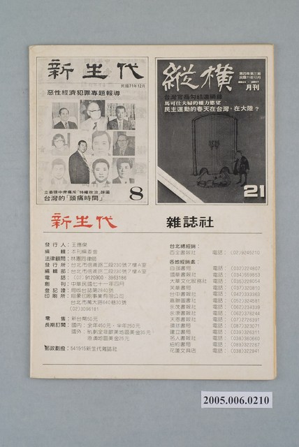 此為新生代雜誌社1983年1月出版的《新生代》雜誌第9號,內容計有〈第一部份:台北市議會-民意代表.特權.金權政治〉、〈「大金牛」的監察院活動記〉、〈我們不做玩牌遊戲-孫院長訪問記〉、〈施性忠是「蘇南成第二」?〉(劉志聰)、〈怎堪落花有意,流水無情?-正確認識王炳章「中國之春」的民主運動〉(李凡)、〈是改革?還是革命?-「中國之春」民主運動之初探〉(樵隱)、〈立監兩院「質詢」權保衛戰〉(唐璜)、〈又見行政命令扺觸法律-「勞工保險條例」的值得商榷處〉( 郭振邦)、〈又見「夏潮」,又見「夏潮」-與蘇慶黎談「夏潮」復刊〉、〈大牢籠裡的小牢籠〉(路程)、〈報禁政策下的民營小型報紙〉( 黃魚)、〈阿斗仔要保重!〉(亮言)、〈一輛賓士軋過〉(廖莫白)等。 《新生代》月刊創刊於1982年4月,總編輯為汪立峽。在當時黨外雜誌的光譜中,《新生代》屬於較為保守穩健的一端,其政論立場傾向於體制內改革,提倡不分黨內外的民主運動。 「黨外」一詞主要為非中國國民黨的臺灣政治勢力,而「黨外」政治勢力,主要的宣傳方式為「黨外雜誌」,「黨外雜誌」最早如1950年代的《自由中國》、1970年代的《大學》、《臺灣政論》,後在1980年代「黨外雜誌」發展蓬勃,代表刊物為《八十年代》與《美麗島》,最終,這股媒體趨勢在1986年民進黨成立、1987年解除戒嚴之後逐漸式微。「黨外雜誌」在當時激起了臺灣民眾的民主意識,也逐步促成了言論自由開放。(蕭淑玲,2006,153-155)。