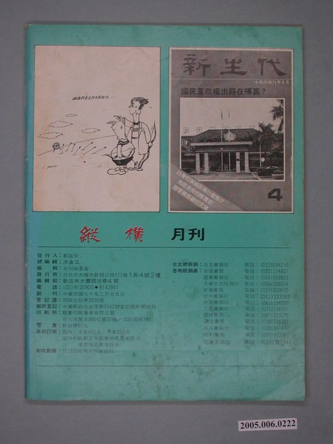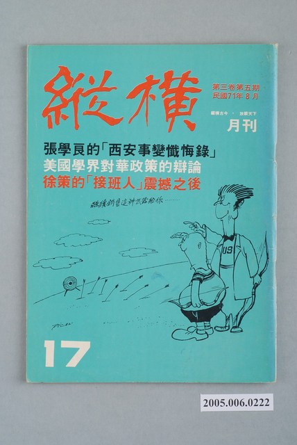 此為縱橫雜誌社1982年8月出版的《縱橫》月刊第3卷第5期第17號,內容計有〈張學良的「西安事變懺悔錄」〉、〈歷史的證言,我們嚴正抗議日本篡改侵華劣跡!〉、〈黨外跟國民黨玩什麼牌?怎麼玩-從三十年歷史經驗析論黨外人士的責任〉(黃魚)、〈兩「鎮」、兩「嬌」靠邊站-黨外主流派的存廢問題〉(徐望山)、〈政治實力與政治心向-試評邱垂亮「中國統一的新構想」〉( 蘇多)、〈關於「接班人」的幾點補充說明〉(徐策)、〈王希哲採訪錄〉(黛絲譯)、〈廣大民眾心版上的一道傷痕-寫於刑訴法修正案通過之後〉(艾揚)、〈林洋港「污」矣!〉(李聲庭)、〈黨外壯大,是託國民黨之福!--常任文官升遷體制有待建立〉(李科員)、〈有正義才有和平(下)-拉丁美洲的新福音運動〉(王隸) 此件為縱橫雜誌社出版的《縱橫》雜誌,最早於1981年由鄭臨安創刊,由宋文誠主編,為1980年代的黨外雜誌之一。《縱橫》試圖連接黨內與黨外勢力,讓國民黨能正視黨外勢力,產生兩黨競爭的利民主改革。另外在統獨立場上,《縱橫》雜誌則反對臺灣獨立,偏向統一立場。 「黨外」一詞主要為非中國國民黨的臺灣政治勢力,而「黨外」政治勢力,主要的宣傳方式為「黨外雜誌」,「黨外雜誌」最早如1950年代的《自由中國》、1970年代的《大學》、《臺灣政論》,後在1980年代「黨外雜誌」發展蓬勃,代表刊物為《八十年代》與《美麗島》,最終,這股媒體趨勢在1986年民進黨成立、1987年解除戒嚴之後逐漸式微。「黨外雜誌」在當時激起了臺灣民眾的民主意識,也逐步促成了言論自由開放。(蕭淑玲,2006,153-155)。