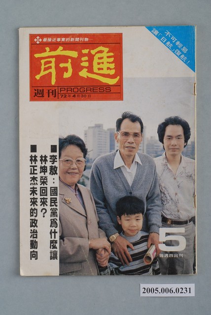 此物件為林正杰創辦的《前進》雜誌系列出版品之一。由於戒嚴期間的出版管制,《前進》面對警總的連番查禁,陸續更改刊名,計有《前進周刊》、《前進廣場》、《前進時代》、《前進世界》等。《前進》之創辦,以「在報禁下尋找更接近真實的客觀報導」為核心理念,其重要創辦人有林正杰、蔡式淵、蔡仁堅,三人皆為民進黨早期派系「前進系」成員。由於認同立場與民進黨在解嚴之後的路線相左,林正杰在1991年民進黨通過「臺獨黨綱」後宣布退黨,其所領導的「前進系」也隨之解散。 「黨外」一詞主要為非中國國民黨的臺灣政治勢力,而「黨外」政治勢力,主要的宣傳方式為「黨外雜誌」,「黨外雜誌」最早如1950年代的《自由中國》、1970年代的《大學》、《臺灣政論》,後在1980年代「黨外雜誌」發展蓬勃,代表刊物為《八十年代》與《美麗島》,最終,這股媒體趨勢在1986年民進黨成立、1987年解除戒嚴之後逐漸式微。「黨外雜誌」在當時激起了臺灣民眾的民主意識,也逐步促成了言論自由開放。(蕭淑玲,2006,153-155)。