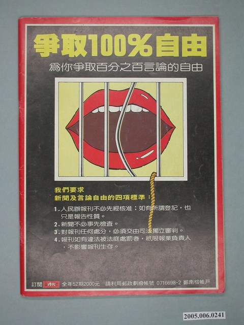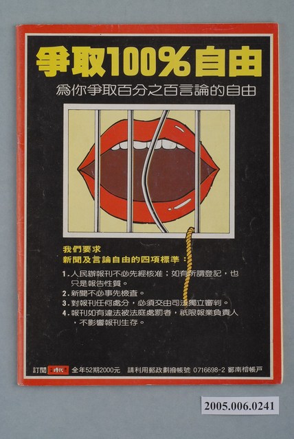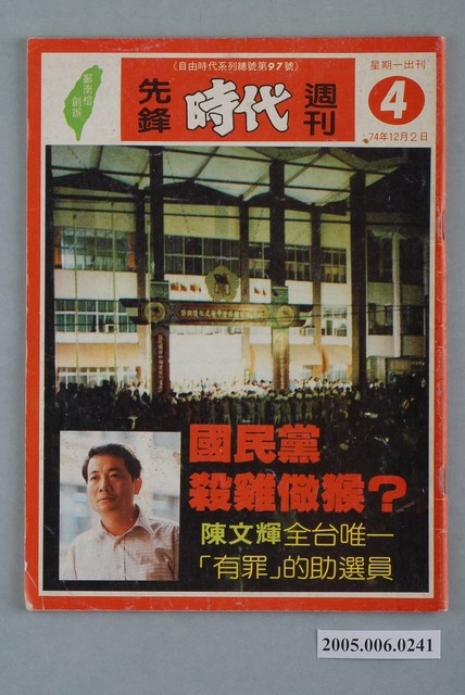 此為自由時代雜誌社1985年12月2日出版的《先鋒時代》週刊第4期97號,內容計有〈自決與台灣前途〈2〉──戰後國際社會對台灣自決的態度與做法〉(林濁水)、〈訪「被逮捕」的陳文輝〉(徐曼青)、〈我們要給選民圓滿的交代──訪施性平談新竹事件〉(徐曼青)、〈陳文輝這個人〉(莫笑天)、〈我樂意代阿扁受難!──吳淑珍傷勢現狀〉(吳言)、〈明年基層選擧大勢評析〉、〈蔣孝武現形記──為了江南案,努力辦棒賽〉( 李擎天)、〈俞國華不動了〉(鄭經)、〈彩色鍋賄選案開庭奇觀〉(李大奇)、〈蔣氏朝代〈16〉──萬縣慘案〉等。 此物件為鄭南榕所創辦的《自由時代》系列雜誌之一。由於意識到出版審查之嚴峻,鄭南榕在刊物創辦之初便註冊了為數眾多的「時代」系列標題,以免後續因遭查禁而無法準時出刊,另《自由時代》為保護相關供稿者,鄭南榕主動承擔《自由時代》一切文責,且不在雜誌目錄頁著錄個別作者姓名。《自由時代》標榜著「爭取百分之百的言論自由」,致力於追蹤黨國內幕、打破禁忌話題,也籌劃街頭社會運動――如「五一九綠色行動」。《自由時代》訴求黨外組黨,在民主進步黨成立後則主張群眾路線,對於較保守的公職路線則加以批判。 「黨外」一詞主要為非中國國民黨的臺灣政治勢力,而「黨外」政治勢力,主要的宣傳方式為「黨外雜誌」,「黨外雜誌」最早如1950年代的《自由中國》、1970年代的《大學》、《臺灣政論》,後在1980年代「黨外雜誌」發展蓬勃,代表刊物為《八十年代》與《美麗島》,最終,這股媒體趨勢在1986年民進黨成立、1987年解除戒嚴之後逐漸式微。「黨外雜誌」在當時激起了臺灣民眾的民主意識,也逐步促成了言論自由開放。(蕭淑玲,2006,153-155)。