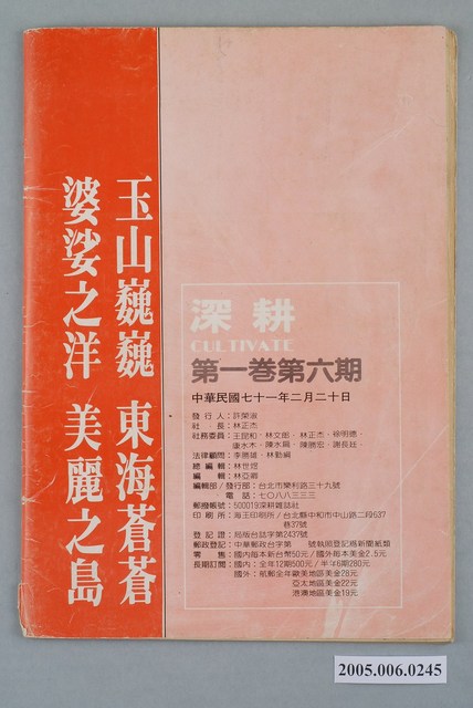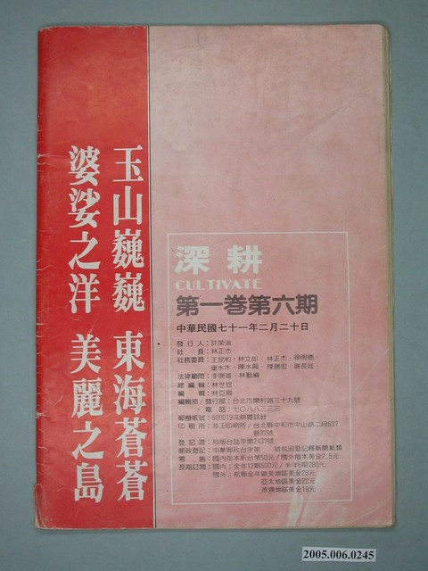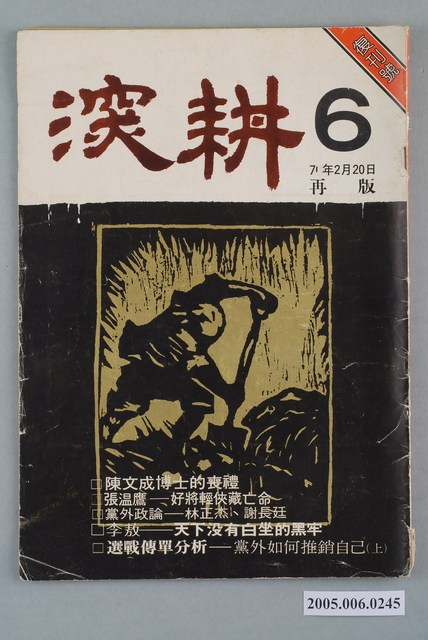 此件為《深耕》雜誌的系列刊物之一,《深耕》為1981年由黃石城創辦的黨外政論雜誌,後交由許榮淑經營,主要主筆人包含林正杰、林世煜、林濁水等,其中內容包括編輯手記、國會趨勢、選舉與黨外動向、生活與政治、鄉土人物、藝文、漫畫等等。《深耕》曾在1982年對於「杯葛事件」中的部分黨外立委進行批判,並引起當時黨外勢力的對立。 「黨外」一詞主要為非中國國民黨的臺灣政治勢力,而「黨外」政治勢力,主要的宣傳方式為「黨外雜誌」,「黨外雜誌」最早如1950年代的《自由中國》、1970年代的《大學》、《臺灣政論》,後在1980年代「黨外雜誌」發展蓬勃,代表刊物為《八十年代》與《美麗島》,最終,這股媒體趨勢在1986年民進黨成立、1987年解除戒嚴之後逐漸式微。「黨外雜誌」在當時激起了臺灣民眾的民主意識,也逐步促成了言論自由開放。(蕭淑玲,2006,153-155)。