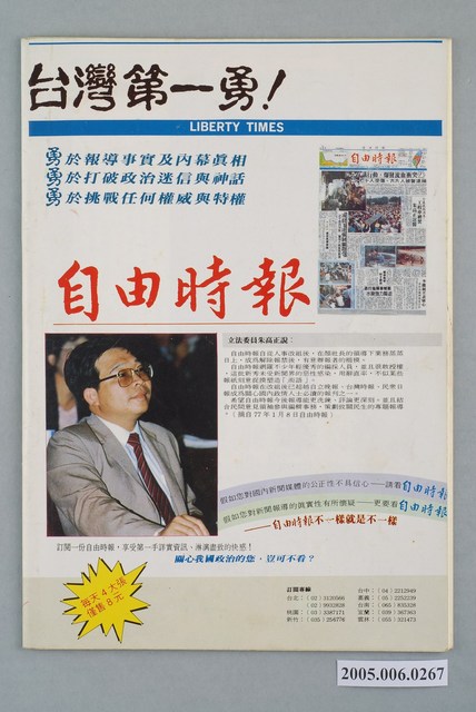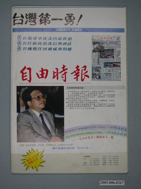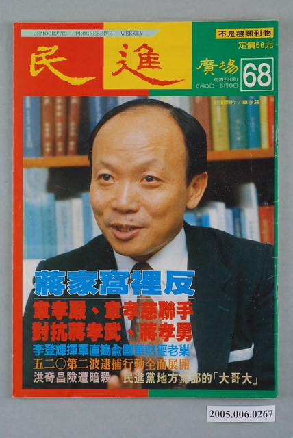 《民進周刊》於1987年2月19日創刊,創辦人為吳祥輝。此刊物曾陸續以《民進時代》、《民進廣場》、《民進天地》、《民進世界》等名稱出版,最終在1980年8月20日停刊。由刊物封面標語「不是機關報」、「人民第一、民進黨第二」可知,《民進周刊》雖然在政治立場與民進黨親近,但是並非隨附性的刊物。 「黨外」一詞主要為非中國國民黨的臺灣政治勢力,而「黨外」政治勢力,主要的宣傳方式為「黨外雜誌」,「黨外雜誌」最早如1950年代的《自由中國》、1970年代的《大學》、《臺灣政論》,後在1980年代「黨外雜誌」發展蓬勃,代表刊物為《八十年代》與《美麗島》,最終,這股媒體趨勢在1986年民進黨成立、1987年解除戒嚴之後逐漸式微。「黨外雜誌」在當時激起了臺灣民眾的民主意識,也逐步促成了言論自由開放。(蕭淑玲,2006,153-155)。 "