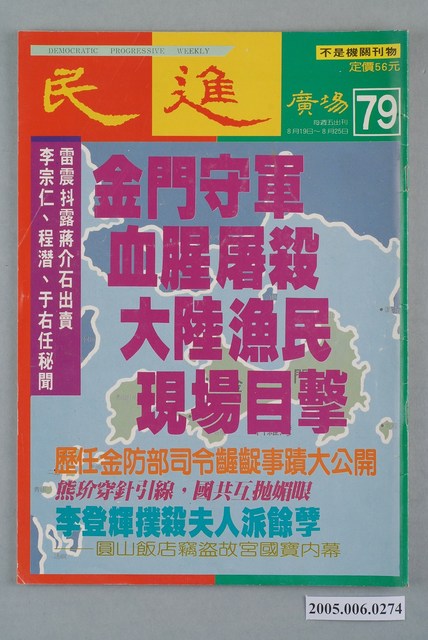 《民進周刊》於1987年2月19日創刊,創辦人為吳祥輝。此刊物曾陸續以《民進時代》、《民進廣場》、《民進天地》、《民進世界》等名稱出版,最終在1980年8月20日停刊。由刊物封面標語「不是機關報」、「人民第一、民進黨第二」可知,《民進周刊》雖然在政治立場與民進黨親近,但是並非隨附性的刊物。 「黨外」一詞主要為非中國國民黨的臺灣政治勢力,而「黨外」政治勢力,主要的宣傳方式為「黨外雜誌」,「黨外雜誌」最早如1950年代的《自由中國》、1970年代的《大學》、《臺灣政論》,後在1980年代「黨外雜誌」發展蓬勃,代表刊物為《八十年代》與《美麗島》,最終,這股媒體趨勢在1986年民進黨成立、1987年解除戒嚴之後逐漸式微。「黨外雜誌」在當時激起了臺灣民眾的民主意識,也逐步促成了言論自由開放。(蕭淑玲,2006,153-155)。 "