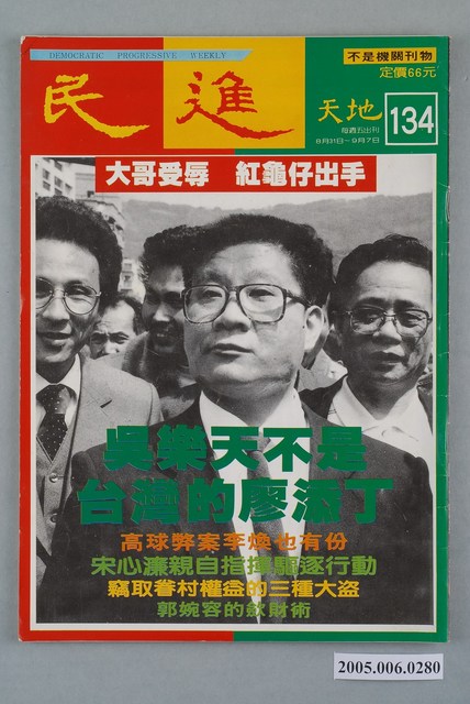《民進周刊》於1987年2月19日創刊,創辦人為吳祥輝。此刊物曾陸續以《民進時代》、《民進廣場》、《民進天地》、《民進世界》等名稱出版,最終在1980年8月20日停刊。由刊物封面標語「不是機關報」、「人民第一、民進黨第二」可知,《民進周刊》雖然在政治立場與民進黨親近,但是並非隨附性的刊物。 「黨外」一詞主要為非中國國民黨的臺灣政治勢力,而「黨外」政治勢力,主要的宣傳方式為「黨外雜誌」,「黨外雜誌」最早如1950年代的《自由中國》、1970年代的《大學》、《臺灣政論》,後在1980年代「黨外雜誌」發展蓬勃,代表刊物為《八十年代》與《美麗島》,最終,這股媒體趨勢在1986年民進黨成立、1987年解除戒嚴之後逐漸式微。「黨外雜誌」在當時激起了臺灣民眾的民主意識,也逐步促成了言論自由開放。(蕭淑玲,2006,153-155)。 "