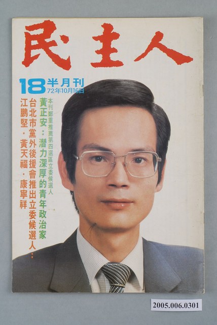 此物件為《民主人》雜誌,於1983年創辦,前身為於1981年創辦的《政治家》雜誌,主要的創辦人為鄧維楨、《民主叢書》、《觀察》等。鄧維楨為《大學雜誌》的創辦人,此雜誌於1960年代末期至1970年代初為臺灣社會帶來監督政府、社會改革的風氣,而到了美麗島事件後,造成民眾對政治議題的關心,鄧維楨也隨之創辦《政治家》雜誌介紹黨外人物,也加以介紹黨外的活動以及評論政治時局。鄧維楨在在臺灣文化界活動,參與創辦遠景、遠流、長橋、鹿橋等出版社,也為重要的黨外人士。 「黨外」一詞主要為非中國國民黨的臺灣政治勢力,而「黨外」政治勢力,主要的宣傳方式為「黨外雜誌」,「黨外雜誌」最早如1950年代的《自由中國》、1970年代的《大學》、《臺灣政論》,後在1980年代「黨外雜誌」發展蓬勃,代表刊物為《八十年代》與《美麗島》,最終,這股媒體趨勢在1986年民進黨成立、1987年解除戒嚴之後逐漸式微。「黨外雜誌」在當時激起了臺灣民眾的民主意識,也逐步促成了言論自由開放。(蕭淑玲,2006,153-155)。