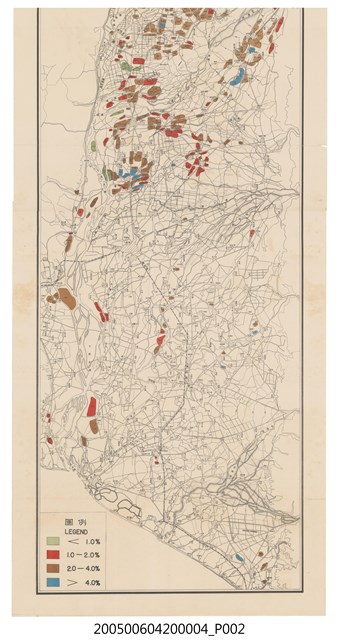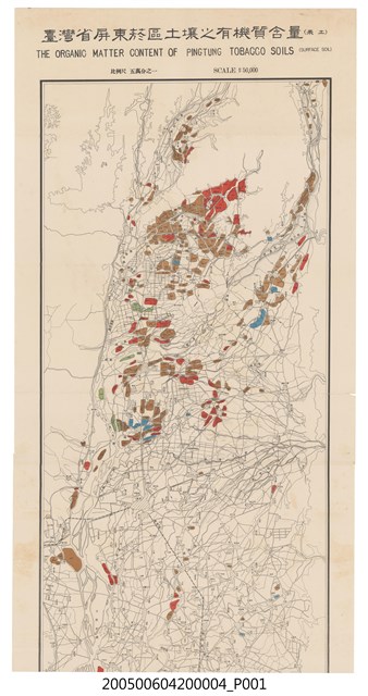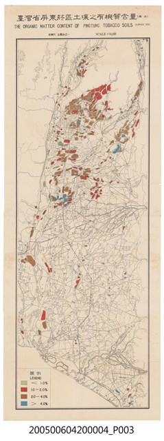 本物件為以臺灣省屏東菸區土壤之有機質含量為主題之地圖,上方標有地圖圖名及比例尺「臺灣省屏東菸區土壤之有機質含量」、「(表土)」、「THE ORGANIC MATTER CONENT OF PINGTUNG TOBACCO SOIL」、「(SURFACE SOIL)」、「比例尺」、「五萬分之一」、「SCALE」、「1:50,000」,中間長方形圖框內有高屏的區域地圖,左下方有一方框中標示「圖例」、「LEGEND」,由上至下以綠色、紅色、咖啡色、藍色表示「<1.0%」、「1.0-2.0%」、「2.0-4.0%」、「>4.0%」。
