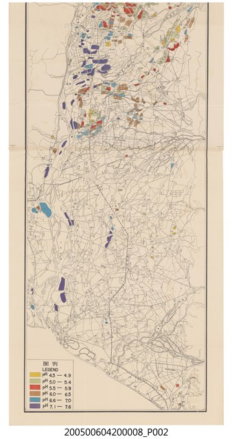 本物件為以臺灣省屏東菸區土壤之酸度為主題之地圖,上方標有地圖圖名及比例尺「臺灣省屏東菸區土壤之有效性磷」、「(表土)」、「THE PH OF PINGTUNG TOBACCO SOIL」、「(SURFACE SOIL)」、「比例尺」、「五萬分之一」、「SCALE」、「1:50,000」,長方形圖框內為屏東區域地圖,其上方偏左部分之菸區塗有各種顏色:紅色、綠色、深藍色、藍色、咖啡色,左下方框內標有「圖例」、「LEGEND」,由上至下分別以黃色、淡綠色、紅色、咖啡色、藍色、深藍色表示「pH4.3-4.9」、「pH5.0-5.4」、「pH5.5-5.9」、「pH6.0-6.5」、「pH6.6-7.0」、「pH7.1-7.6」。