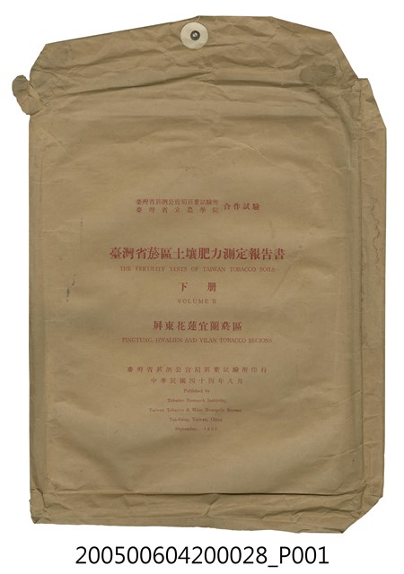 本物件為《臺灣省菸區土壤肥力測定報告書》下冊之封套,其正面為一只長方形土黃色的紙袋,上方白色封扣繫有細繩,封面文字由上至下印刷為「臺灣省菸酒公賣局菸葉試驗所」、「臺灣省立農學院」、「合作試驗」、「臺灣省菸區土壤肥力測定報告書」、「THE FERTILITY TESTS OF TAIWAN TOBACCO SOILS」、「下冊」、「VOLUME II」、「屏東花蓮宜蘭菸區」、「PINGTUNG, HWALIEN AND YILAN TOBACCO REGIONS」、「臺灣省菸酒公賣局菸葉試驗所印行」、「中華民國四十四年九月」、「Published by」、「Tobacco Research Institute,」、「Taiwan Tobacco & Wine Monopoly Bureau」、「Taichung, Taiwan, China」、「September, 1955」。