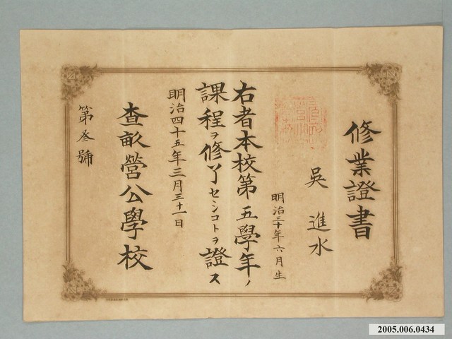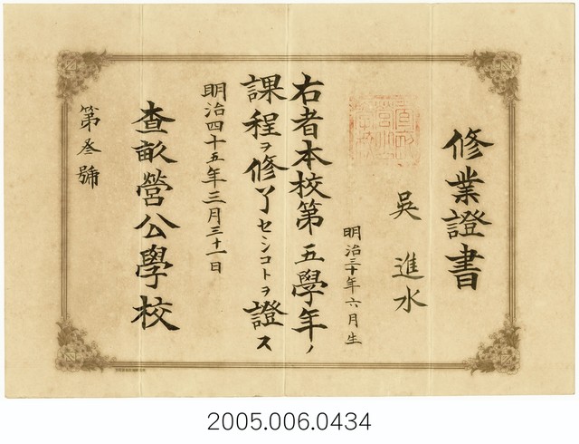 2005.006.0434 吳進水查畝營公學校修業證書