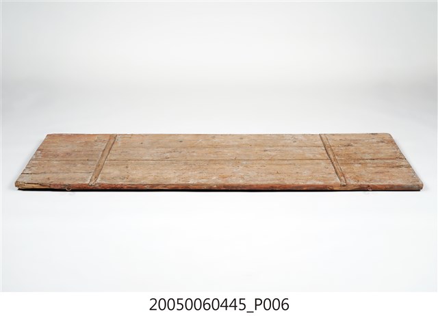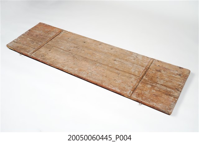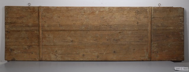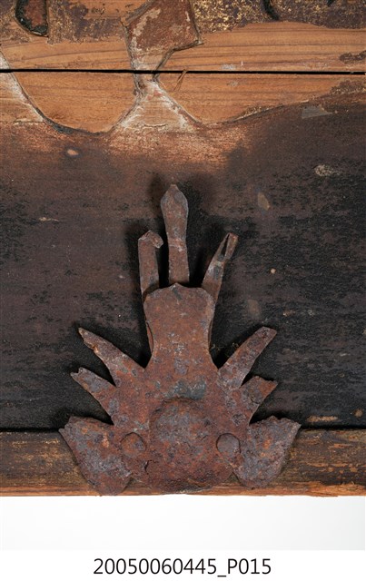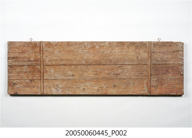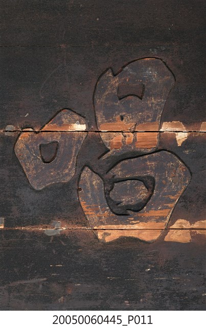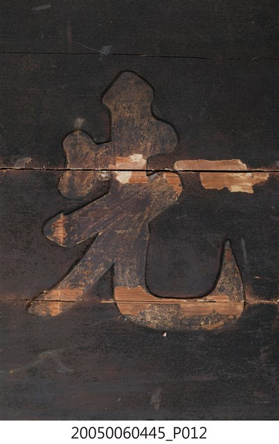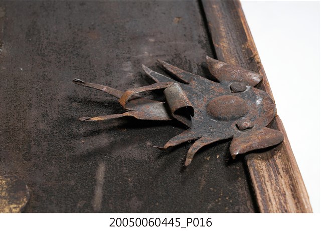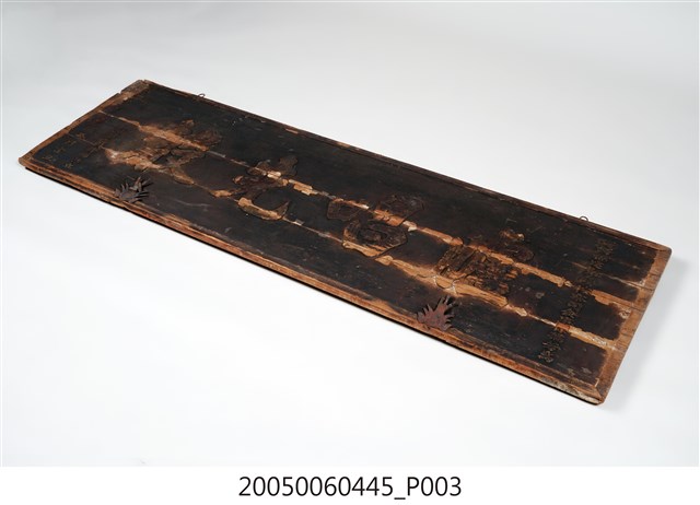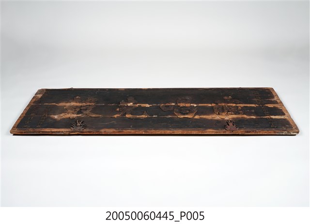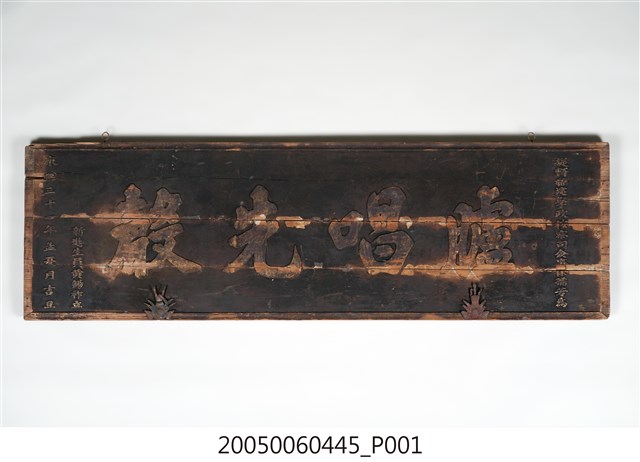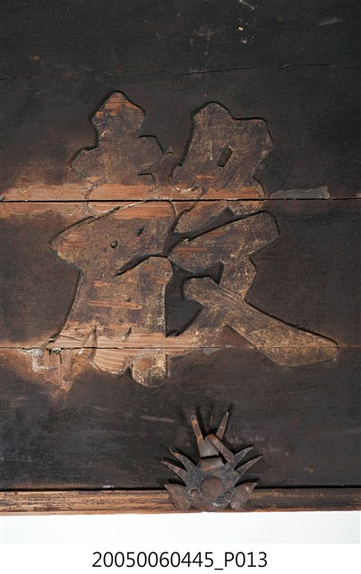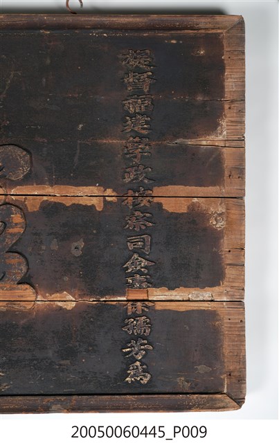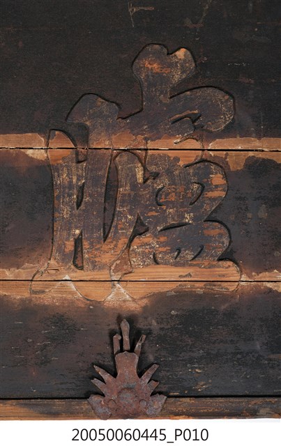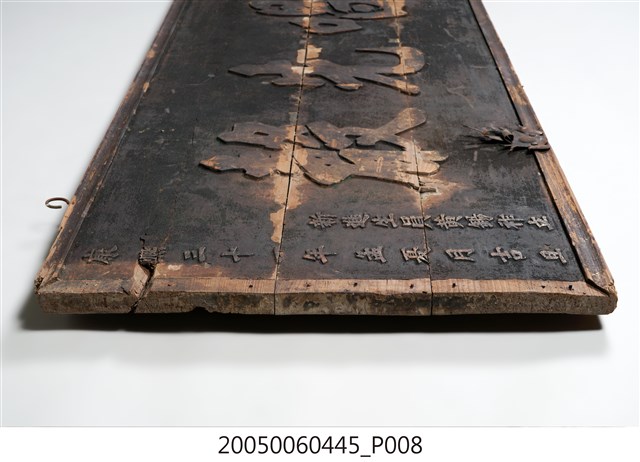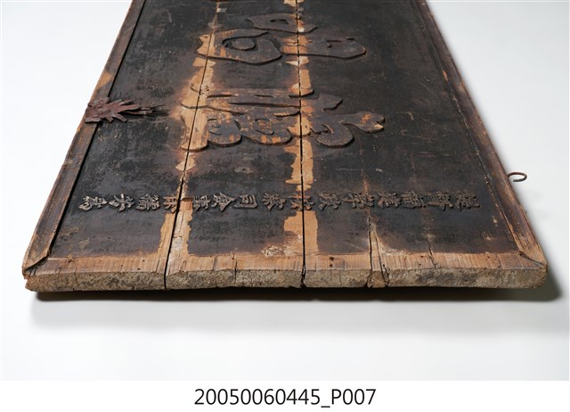 3.此匾主體係由3塊長形木頭拼接而成,背面有兩條垂直木條固定,原本左右兩應釘有邊框,下方另有兩個被釘子固定的金屬片。