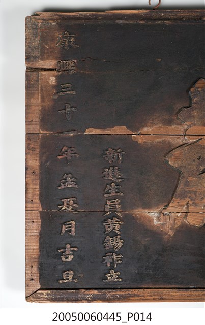 1.本件為康熙31年黃錫祚「臚唱先聲」木製匾額,上款「提督福建按察司僉事徐儒芳爲」,中間為四大字匾詞「臚唱先聲」,下款為「新進生員黃錫祚立 康熙三十一年孟夏月吉旦」。依其紀年可知此匾是康熙31年(1692)所立,上款「徐儒芳」,為浙江仁和縣人,順治16年(1659)進士。立匾人黃錫祚為鄉試新進秀才。