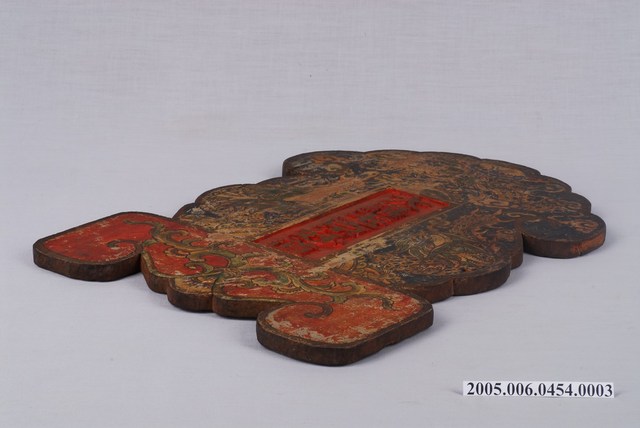 本組道教洞案神牌為一組三件,以木雕彩繪方式製作,外觀呈上半部龍牌、下半部底座的聖旨牌造形。龍牌的形式類似龍頭籤彩紙,中央一道直框,上方彩繪一條整正面蟠龍,兩旁各一條尾部朝上的降龍。中央框內三面分別鐫刻扁形宋體字:「大羅玉京妙道」、「龍章鳳篆真文」、「華堂內境高僊」,分別代表道教至尊三清道所主之至妙道法,道教經典、文檢等文字之尊奉,以及道教法壇所啟請的諸位仙真,下方底座在朱紅底色上繪纏枝花卉。