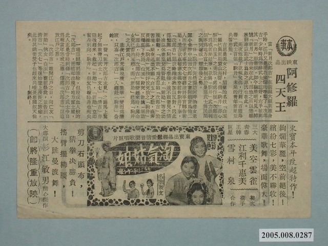 本件保存情況良好,為雙面印刷。播放的戲院為第一劇場,其餘部分為電影阿修羅四天王、淘氣姑娘。本片描述縫箔師的女兒朝倉玲子在畢業之前父母不幸過世,為了同父異母的妹妹只好退學工作以支出妹妹的學費。後來在百貨店的評選會上,玲子的作品得到了設計師宮本的好評,訂單也接連而來,減輕了玲子為妹妹負擔學費的壓力。後來玲子受到好友澄江的邀請去日光玩,卻遇到了自己的親生母親,面對素未謀面的母親而受到極大衝擊的玲子在晚上散心時不小心被剛好在這的宮本開車撞上,玲子右手負傷再也無法工作。眼看玲子就要付不出妹妹的學費,宮本決定將玲子接