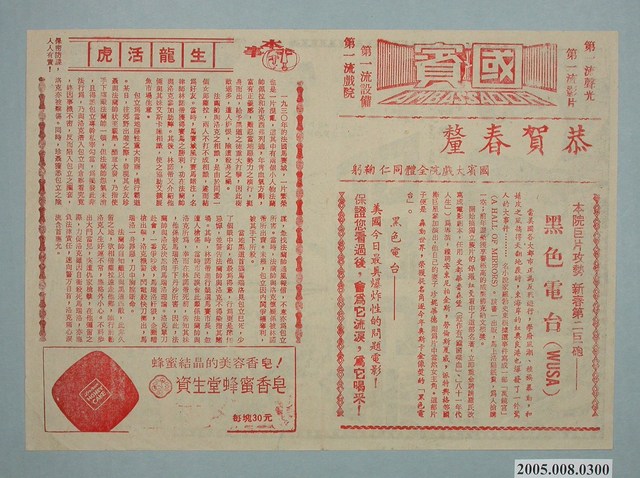 本件保存情況良好,為雙面印刷。播放的戲院為國賓戲院。其餘部分為電影生龍活虎。在美國的南方,萊茵哈特(Rheinhardt)在新奧爾良擔任右翼無線電台WUSA的播音員。萊茵哈特(Rheinhardt)不會對WUSA的右翼反動立場的社論有什麼特別的動作,即使他不同意那些說法。後來萊茵哈特(Rheinhardt)在一間酒吧遇到了嬌拉汀(Geraldine),這名女子完全顛覆了萊茵哈特(Rheinhardt)對WUSA的想法,還有瑞尼(Rainey),這個理想主義者的鄰居察覺到了WUSA的不對勁和黑幕。 終於當事