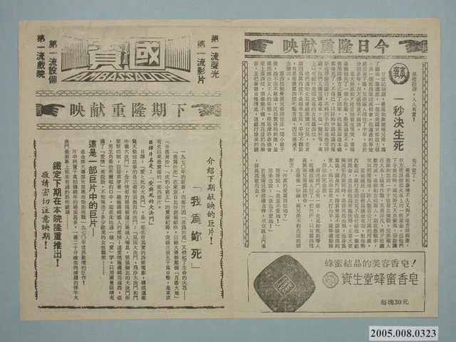 本件保存情況良好,為雙面印刷。播放的戲院為國賓戲院。其餘部分為電影一秒決生死。約翰.華納(John Warner)是美國同盟國的士兵。當他收到一條消息說他懷孕的情人即將分娩時,他拋下職務執意要去墨西哥見情人,在前往墨西哥的途中,他因逃兵被捕並被帶到法庭,但是在兩位老朋友的幫助下John成功逃脫。但是當他到達了情人所在的小鎮時,發現一切已經太晚了,情人在分娩的期間去世了,只留下了孩子。John試圖作為一個父親養育孩子,但這個城鎮的居民並不歡迎約翰,因此發生了另一場悲劇,孩子夭折了。在這雙重打擊下,約翰決定報