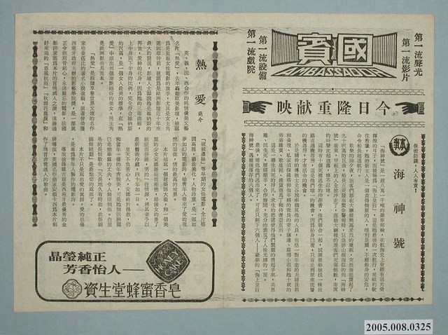 本件保存情況良好,為雙面印刷。播放的戲院為國賓戲院。其餘部分為電影海神號。大衛(David)和安娜(Anna)是一對新婚夫婦,當兩人幻想往後幸福的生活時安娜出現了一些異變,經過診斷後發現她患上了一種嚴重且罕見的神經疾病而且所剩下的日子不多了,當安娜因為病症昏迷時,大衛央求醫生是否有拯救她的方法,醫生說唯一的方法是將安娜冷凍,直到能夠有藥完全治癒的時候,而大衛接受了。經過了40年,終於有藥能夠治癒安娜,而康復的她在醫院醒來時不停問著自己的丈夫在哪,這是她的好友告訴她時間已經過了40年,而她的父母已經去世,丈