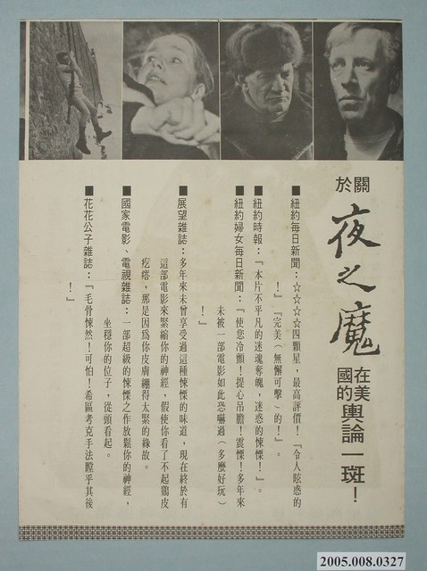 本件保存情況良好,為雙面印刷。播放的戲院為大新竹戲院。一個名叫薩勒姆(Salem)的男子逃離了精神病院,因為他在一場使用斧頭的謀殺罪中被判刑,薩勒姆逃出來是因為他認為他是被誣陷的,被他妹妹的丈夫安東(Anton)所陷害,而一名負責調查的警察必須在薩勒姆復仇之前查明事情的真相,究竟是薩勒姆精神錯亂抑或者真的是被妹夫安東栽贓的。由麥斯.馮.西度Max von Sydow、皮爾.奧斯卡森(Per Oscarsson)、麗芙.烏曼(Liv Ullmann)、特雷弗.霍華德(Trevor Howard)主演。
