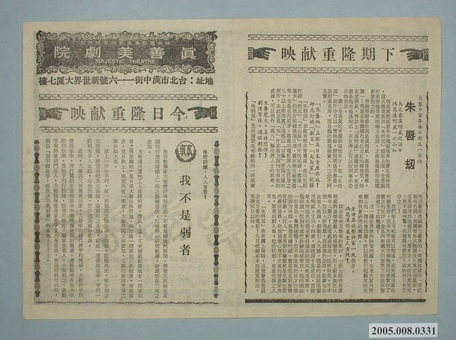 本件保存情況良好,為雙面印刷。播放的戲院為真善美戲院。其餘部分為電影我不是弱者。模特兒克莉絲(Chris)被她妹妹的音樂老師高登・史都華(Gordon Stuart)強姦。 但是在高登對犯罪行為並不認帳而且被陪審團認定無罪後,高登找到了新的受害者即是她的學生。 由於高登愈來愈無法無天,克莉絲決定對他進行復仇,為那些收害者出一口氣。瑪歌・海明威(Margaux Hemingway)、克里斯・沙蘭登(Chris Sarandon)主演。