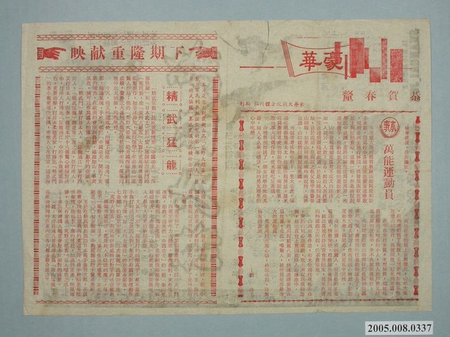 本件保存情況尚可,為雙面印刷。播放的戲院為豪華戲院。其餘部分為電影萬能運動員。一名剛剛抵達美國的中國武術高手,為了墨西哥奴隸的自由,決心用自己的武術戰勝殘忍的奴隸主人。由李一龍主演。