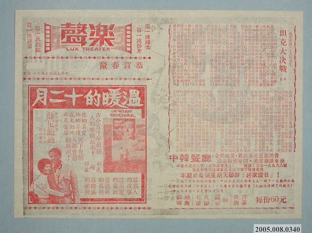 本件保存情況尚可,為雙面印刷。播放的戲院為樂聲戲院。其餘部分為電影坦克大決戰、溫暖的十二月。在白天,雷布利是個天生萬人迷還是媒體注目的寵兒,他總是不吝展現他不斐的身價,而身邊還有個忠心聰明的日裔上海人助理加藤。但是到了晚上,雷布利與加藤就會化身為蒙面英雄青蜂俠,為正義出擊。由范.威廉斯(Van Williams)、李小龍主演。