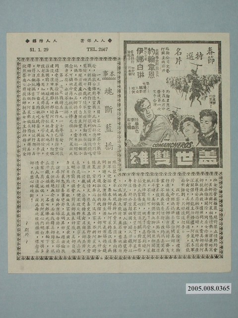 本件保存情況良好,為雙面印刷。播放的戲院為豐中戲院。其餘部分為電影蓋世雙雄、江湖浪子、魂斷藍橋、春光無限好。喬治.雷德克里夫(George Radcliffe)是一起謀殺案的主要嫌疑人,當晚他的同事被刺死,裝有前的郵袋不翼而飛,喬治被懷疑涉有重嫌但最終仍判無罪。五年之後,他的妻子收到一封信,信上指稱喬治其實有犯罪。喬治的妻子在回想起這五年的各種點點滴滴後發現丈夫越來越可疑,丈夫在五年中一直對她撒謊,後來妻子找到一名男子克雷(Clay)說她曾目擊喬治犯案,她就越相信丈夫是殺人兇手。而憤怒的妻子決定與喬治談判