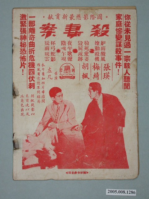 1. 粵語片《梁祝恨史》電影特刊,由堤岸合眾承印,特刊封面上是手繪圖樣及兩位主角芳艷芬、任劍輝的電影劇照;內頁則主要是該片的歌曲歌詞與劇照、電影本事,以及《一入侯門深似海》與《殺妻案》之電影廣告;其中並有一頁越南文的電影介紹。而封底為國語片《殺妻案》的電影劇照及文案廣告。