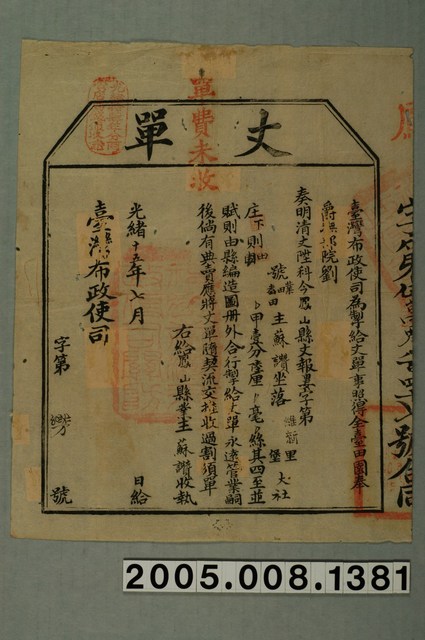 2005.008.1381 光緒15年臺灣布政使司給蘇讚丈單