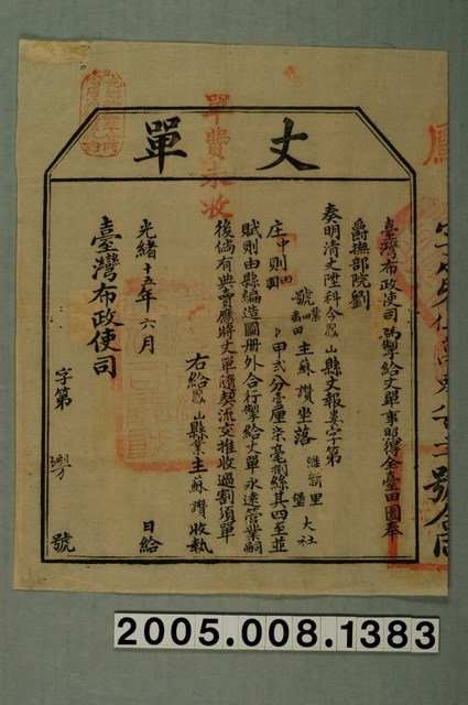 2005.008.1383 光緒15年臺灣布政使司給蘇讚丈單