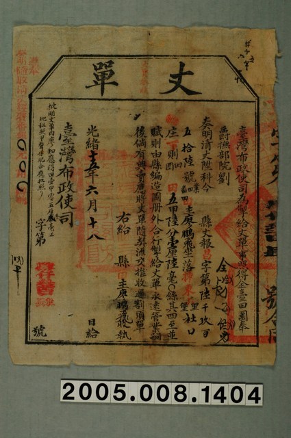 2005.008.1404 光緒15年臺灣布政使司給廖鵬飛丈單
