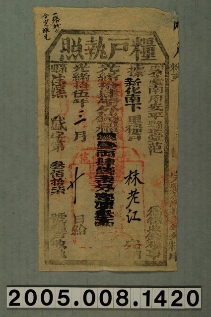 2005.008.1420 光緒15年臺南府安平縣正堂給林老江糧戶執照