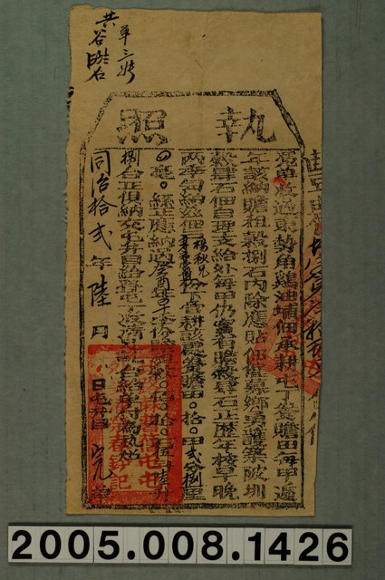 2005.008.1426 同治12年蔴薯舊社屯外委潘榮春給楊秋兄承耕孝希營盤屯田租穀完納執照