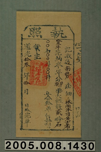 2005.008.1430 道光13年猫羅社通事給南勢庄佃人林漍□頂黃士希執照