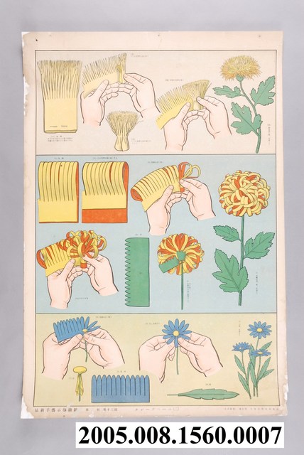 本文物為最新手藝示導掛圖:第二輯第十三圖皺紋紙(原文:クレープペーパ)(二),圖片內容為使用皺紋紙製作紙花的參考步驟,包含:彎折鐵線、捆繞色紙、裁剪等製作程序。由日本出版株式會社發行。由此文物得知,當時手工藝品的展示指導圖片。