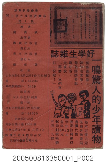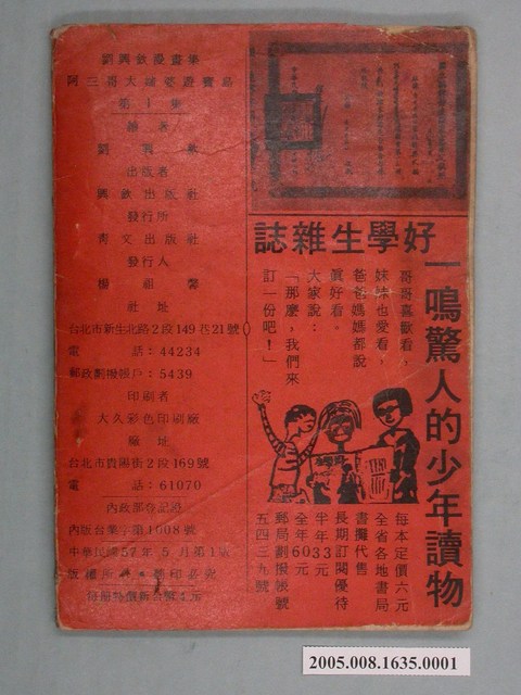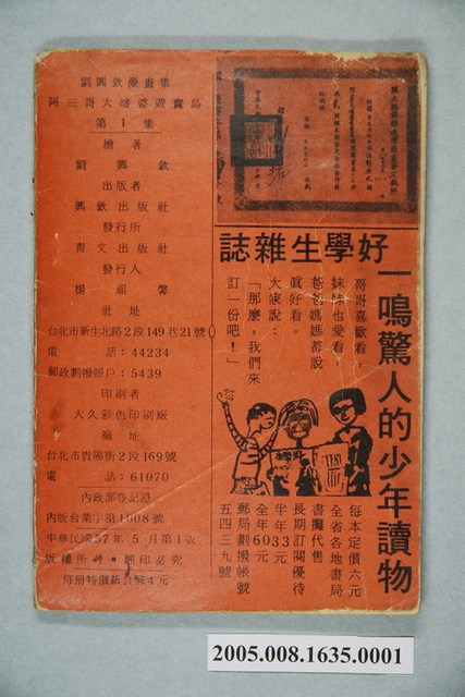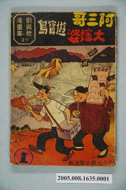 1.本件《劉興欽漫畫集37-阿三哥大嬸婆遊寶島(1)》由興欽出版社出版,青文出版社發行,民國57年出版。封面以阿三哥背冰箱,大嬸婆賣獎券的圖像為封面,內容講述阿三哥和大嬸婆在臺北做生意不順後,乾脆相邀遊台灣,一路上邊遊玩,邊做生意所發生的奇遇及趣事。書後並附有一顏炳耀著的短篇傳奇故事〈杜子春和鐵冠子〉。2.劉興欽於1934年出生於今新竹縣橫山鄉,1954年開始畫漫畫。其正式投入漫畫,是擔任北市永樂國小教師期間。1971年到1979年從事發明,獲得國內專利140多項、國際專利43項。於1991年移民美國舊金山,在《北美世界日報》連載漫畫「大嬸婆在美國」,並於舊金山創立「大嬸婆創意學校」免費教導華人子弟學習母語,同時也致力於「台灣民俗紀錄」畫作,至今已經累積300多幅作品。該漫畫家以〈阿三哥與大嬸婆〉等漫畫,著稱於世。