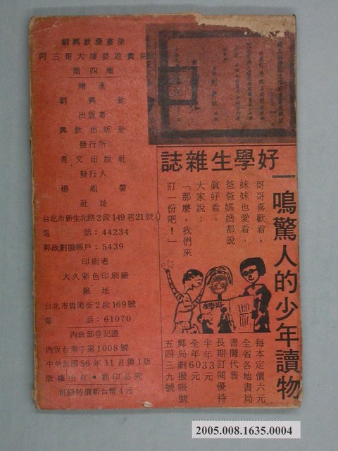 1.本件《劉興欽漫畫集41-阿三哥大嬸婆遊寶島(4〉》,由興欽出版社出版,青文出版社發行,民國56年出版。封面設計以阿三哥和大審查在彰化八卦山大佛下的石獅前,兩人興奮聊天的景象,以此為封面設計主題。內容講述阿三哥及大嬸婆一路遊玩來到彰化,到彰化八卦山大佛遊樂及一路上發生的趣事。2.劉興欽於1934年出生於今新竹縣橫山鄉,1954年開始畫漫畫。其正式投入漫畫,是擔任北市永樂國小教師期間。1971年到1979年從事發明,獲得國內專利140多項、國際專利43項。於1991年移民美國舊金山,在《北美世界日報》連載漫畫「大嬸婆在美國」,並於舊金山創立「大嬸婆創意學校」免費教導華人子弟學習母語,同時也致力於「臺灣民俗紀錄」畫作,至今已經累積300多幅作品。該漫畫家以〈阿三哥與大嬸婆〉等漫畫,著稱於世。
