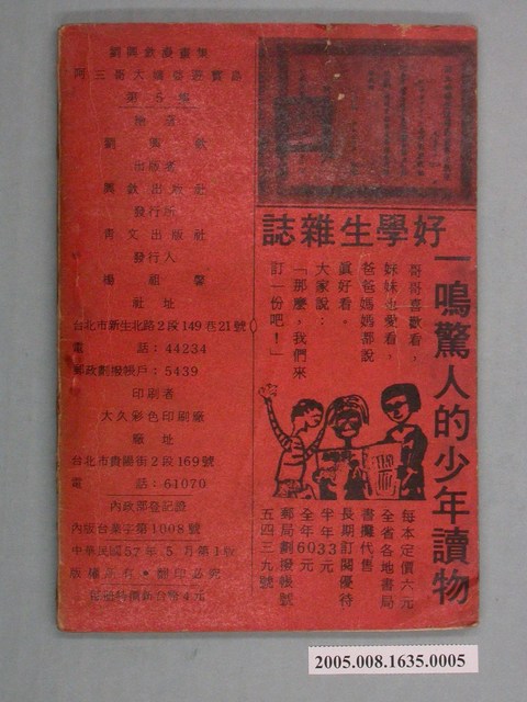 1.本件《劉興欽漫畫集63-阿三哥大嬸婆遊寶島(5)》由興欽出版社出版,青文出版社發行,民國57年出版。封面以阿山哥和大嬸婆在阿里山鐵路上,背後並有阿里山的神木,以此為意象,表現他們二人來到阿里山。內容講述阿三哥及大嬸婆一路遊玩,來到阿里山一帶所發生的趣事。2.劉興欽於1934年出生於今新竹縣橫山鄉,1954年開始畫漫畫。其正式投入漫畫,是擔任北市永樂國小教師期間。1971年到1979年從事發明,獲得國內專利140多項、國際專利43項。於1991年移民美國舊金山,在《北美世界日報》連載漫畫「大嬸婆在美國」,並於舊金山創立「大嬸婆創意學校」免費教導華人子弟學習母語,同時也致力於「臺灣民俗紀錄」畫作,至今已經累積300多幅作品。該漫畫家以〈阿三哥與大嬸婆〉等漫畫,著稱於世。