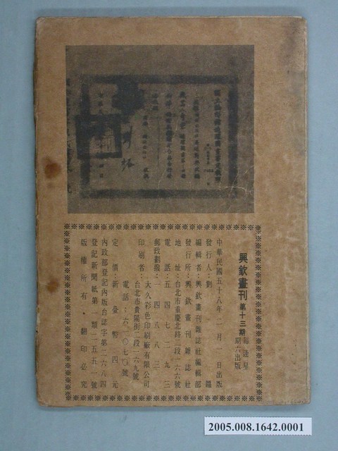 1.本件《興欽畫刊13-機器人奇案(1)》民國58年由興欽畫刊雜誌社出版。封面以機器人與阿金在機器實驗室內的圖像為封面,內容講述機器人與阿金幫忙破案的故事,表彰「勇敢、善良、清純並且勤學向上是我們青少年的本性」。2.劉興欽於1934年出生於今新竹縣橫山鄉,1954年開始畫漫畫。其正式投入漫畫,是擔任北市永樂國小教師期間。1971年到1979年從事發明,獲得國內專利140多項、國際專利43項。於1991年移民美國舊金山,在《北美世界日報》連載漫畫「大嬸婆在美國」,並於舊金山創立「大嬸婆創意學校」免費教導華人子弟學習母語,同時也致力於「臺灣民俗紀錄」畫作,至今已經累積300多幅作品。該漫畫家以〈阿三哥與大嬸婆〉等漫畫,著稱於世。