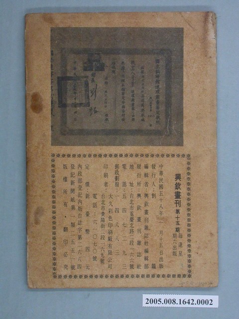1.本件《興欽畫刊15-機器人奇案(2)》民國58年由興欽畫刊雜誌社出版。封面以機器人潛到海中,內容講述由劉興欽創作出來的機器人角色,潛到海中的沈船查案的故事。2.劉興欽於1934年出生於今新竹縣橫山鄉,1954年開始畫漫畫。其正式投入漫畫,是擔任北市永樂國小教師期間。1971年到1979年從事發明,獲得國內專利140多項、國際專利43項。於1991年移民美國舊金山,在《北美世界日報》連載漫畫「大嬸婆在美國」,並於舊金山創立「大嬸婆創意學校」免費教導華人子弟學習母語,同時也致力於「臺灣民俗紀錄」畫作,至今已經累積300多幅作品。該漫畫家以〈阿三哥與大嬸婆〉等漫畫,著稱於世。