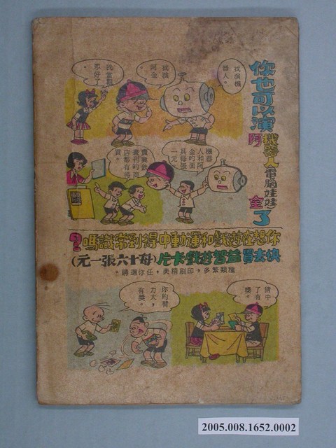1.本件《興欽畫刊51-機器人戰豹人(下)》,封面以直升機來援,以及機器人解脫,和原住民歡樂慶祝的景象為主題,內容講述機器人驚險脫困的過程。2.劉興欽於1934年出生於今新竹縣橫山鄉,1954年開始畫漫畫。其正式投入漫畫,是擔任北市永樂國小教師期間。1971年到1979年從事發明,獲得國內專利140多項、國際專利43項。於1991年移民美國舊金山,在《北美世界日報》連載漫畫「大嬸婆在美國」,並於舊金山創立「大嬸婆創意學校」免費教導華人子弟學習母語,同時也致力於「臺灣民俗紀錄」畫作,至今已經累積300多幅作品。該漫畫家以〈阿三哥與大嬸婆〉等漫畫,著稱於世。
